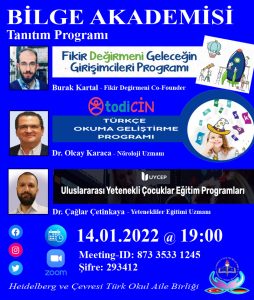 Almanya/ Heidelberg ve Çevresi Türk Okul Aile Birliğinin uzantısı BİLGE AKADEMİSİ , gönüllü eğitim danışmanlığı platformunun , nitelikli eğitim ve eğitimde fırsat eşitliği kavramlarıyla hareket ederek, sosyal fayda ilkesiyle oluşturduğu çevrimiçi seminerlerimizin ilki 14.ocak.2022, Almanya saati ile 19.00 da. (**tüm Almanya ve Avrupa’dan katılıma açık. Türkiye’den de katılıma açık**)